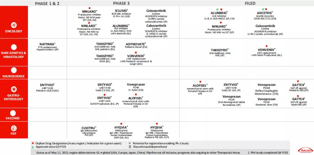 其中,武田的旗舰产品,胃肠道药物ENTYVIO®(维得利珠单抗)已在日本和美国提交申请,该药物还有两个项目处于3期临床试验,其用于预防移植物抗宿主病已获孤儿药认定;