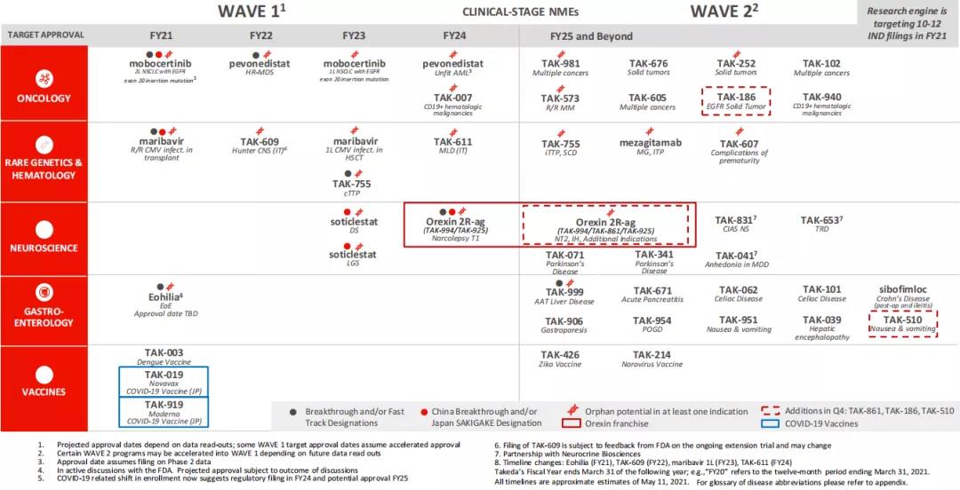 值得一提的是,武田的wave1计划中包含了两款新冠疫苗,分别是与Novavax合作研发的TAK-019,以及与Moderna共同开发的TAK-919,并计划于2021年在日本上市。此外,还有武田四价登革热候选疫苗TAK-003,已完成首次监管申报,有望于2021财年在欧盟和一些登革热流行国家获得批准。