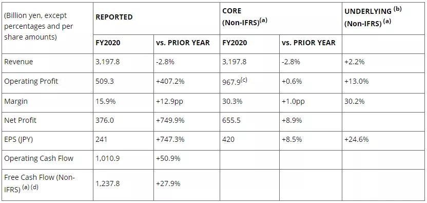 2020财年,武田制药的营业利润为5093亿日元(约合46亿美元),同比增长407.2%,主要业务利润来自非核心资产出售和收购相关的费用。归母净利润为3760亿日元(约34亿美元),同比增长749.9%。核心运营利润同比增长至9679亿日元(约合88亿美元),核心营业利润率为30.3%。进一步调整了外汇和资产剥离的影响,基础核心营业利润率为30.2%,年同比增长13%。主要财务数据如下: