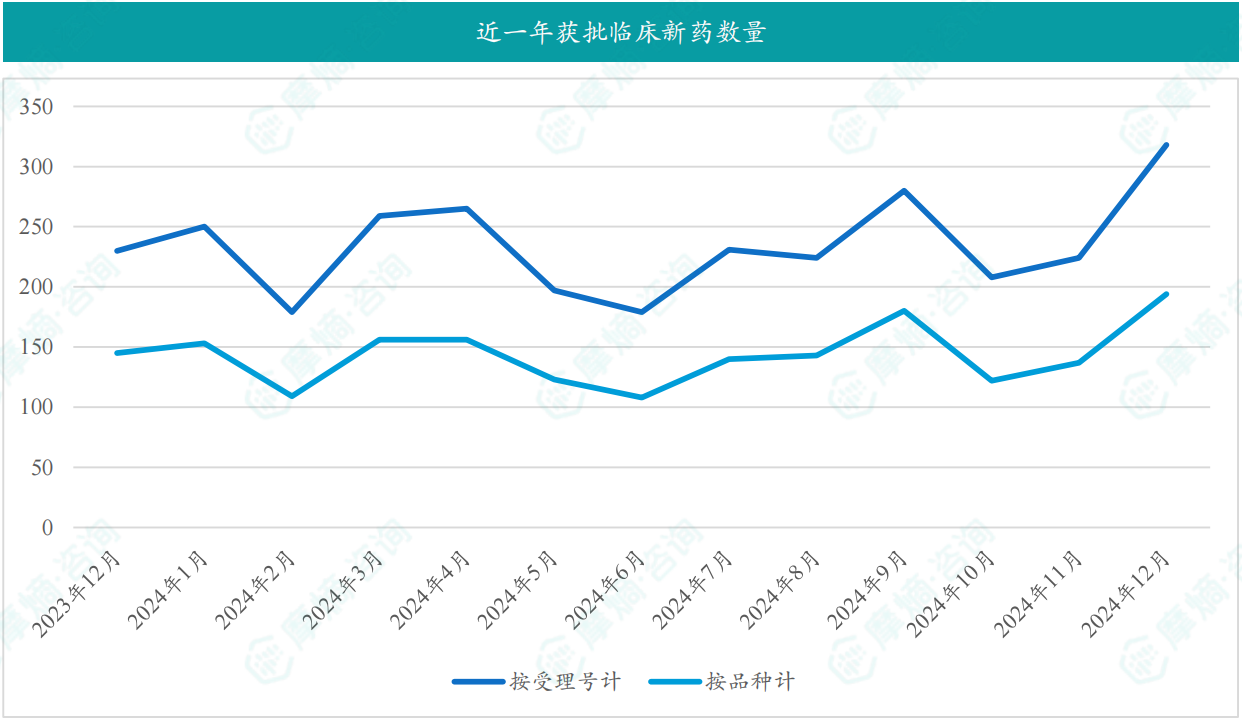 根据摩熵数据统计,2024年12月共有194款新药获批临床(共计318个受理号),较上个月增加了57款,其中包括75款化药,108款生物制品,11款中药。