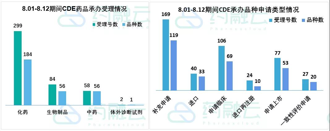 根据药融云中国药品审评数据,8月1号-8月12号期间共297个(按品种计,下同)药品获CDE承办,包括化药184个,生物制品56个,中药56个,,体外诊断试剂1个。