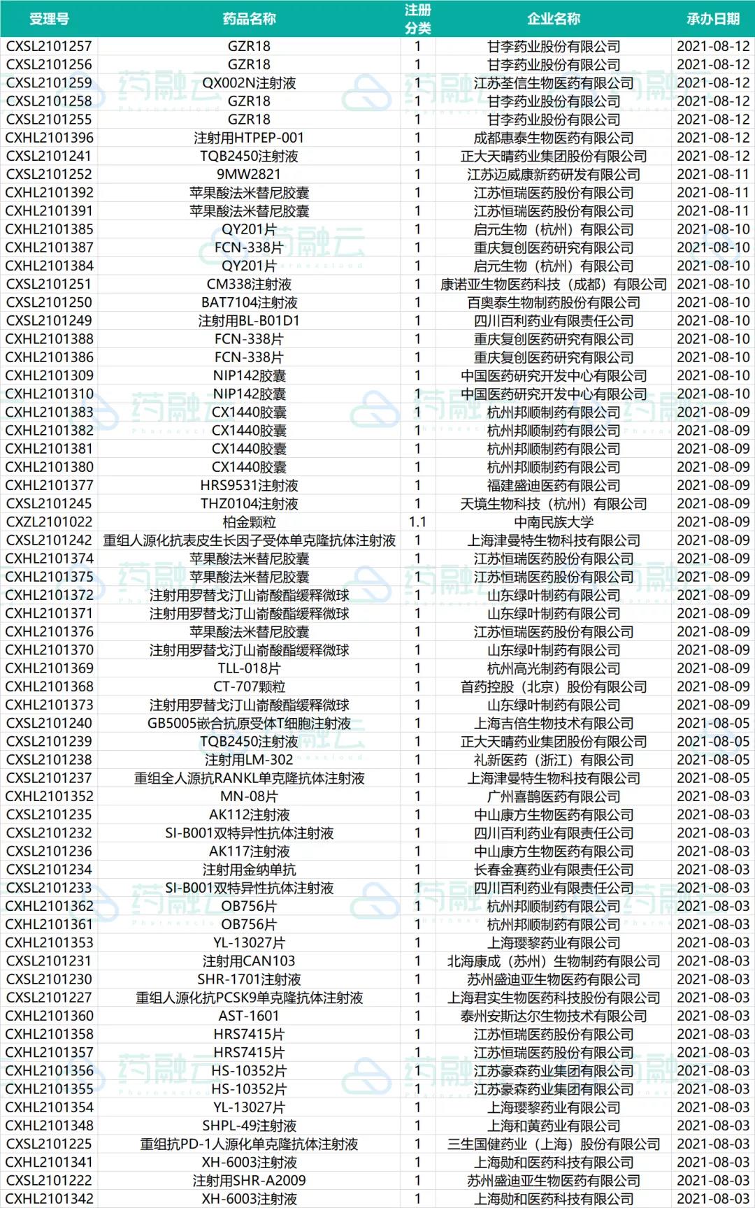 2021.08.01-2021.08.12期间药审中心受理总量为443个,涉及品种297个,涉及康方、正大天晴、恒瑞等企业