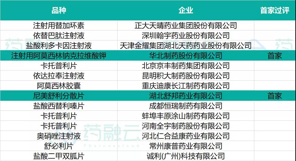 2021年8月20日至8月26日期间,共有12个品种通过(含视同通过)一致性评价。有华北制药「注射用阿莫西林钠克拉维酸钾」和湖北舒邦药业「尼美舒利分散片」2款首仿获批上市,具体信息如下: