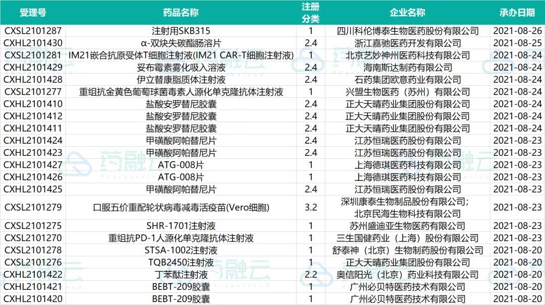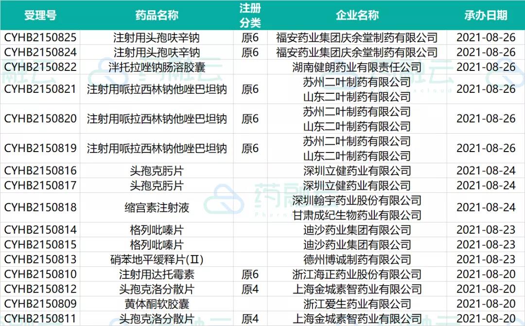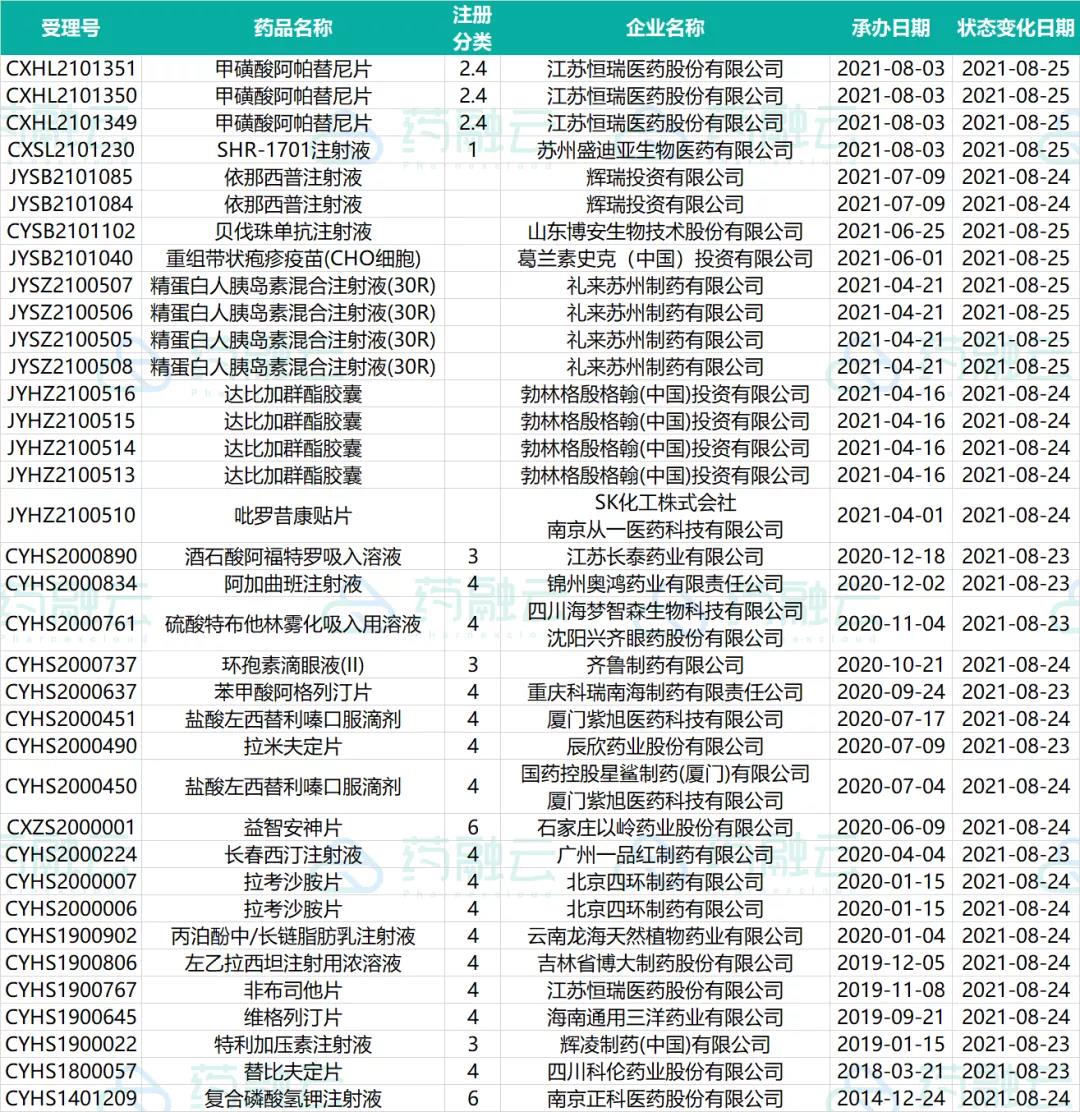 数据统计时间段为2021年8月20日-2021年8月26日,药融云将定期公示药品审评审批信息,关注我们即可定期查看。如有疏漏,欢迎指正!