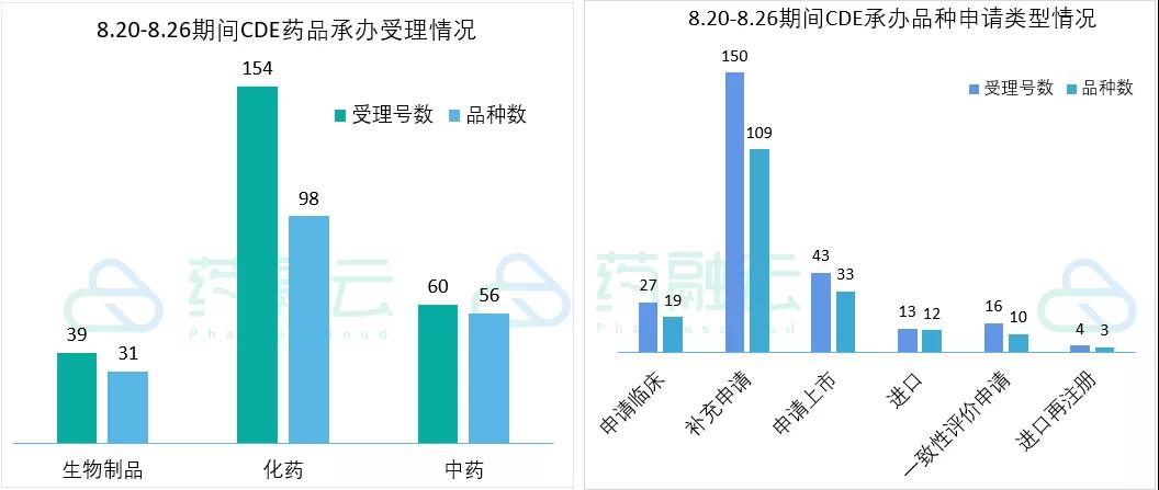 根据药融云中国药品审评数据,8月20号-8月26号期间共185个(按品种计,下同)药品获CDE承办,包括化药98个,生物制品31个,中药56个。