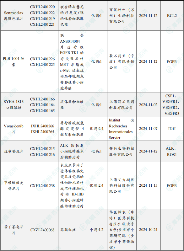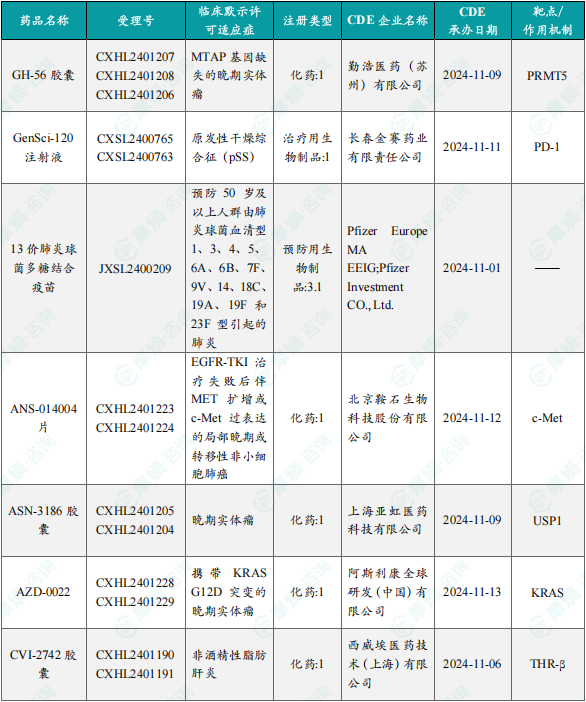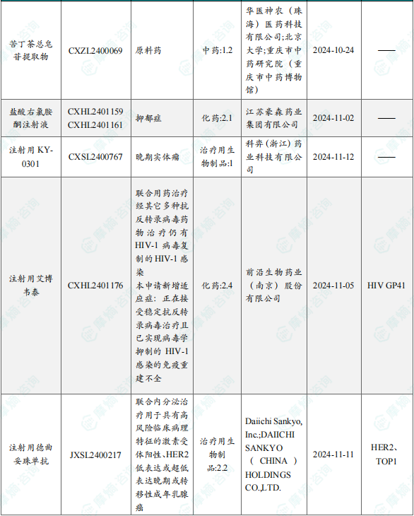 备注:(1)此处未包括补充申请之情形;(2)此处所列创新药/改良型新药,主要是指CDE受理批准的1类、2类、5.1类以及生物制品3.1类和3.2类。(3)更多获批临床信息及研发进展详情及相关靶点全局分析等,可通过摩熵中国药品审评数据库获取并下载EXCEL表格。