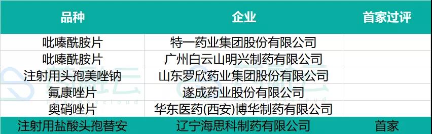 - 5个品种通过(含视同通过)一致性评价,辽宁海思科制药「注射用盐酸头孢替安」首家过评;