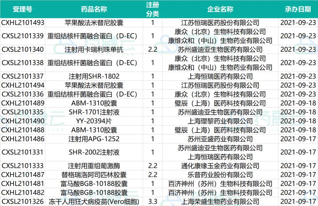 9月17日至9月23日期间共112个(按品种计,下同)药品获CDE承办,包括化药76个,生物制品16个,中药20个。近期CDE承办的共有1款新药申请上市,15个品种申报临床,其中包括13款国产新药,另有8个品种提交一致性评价。
