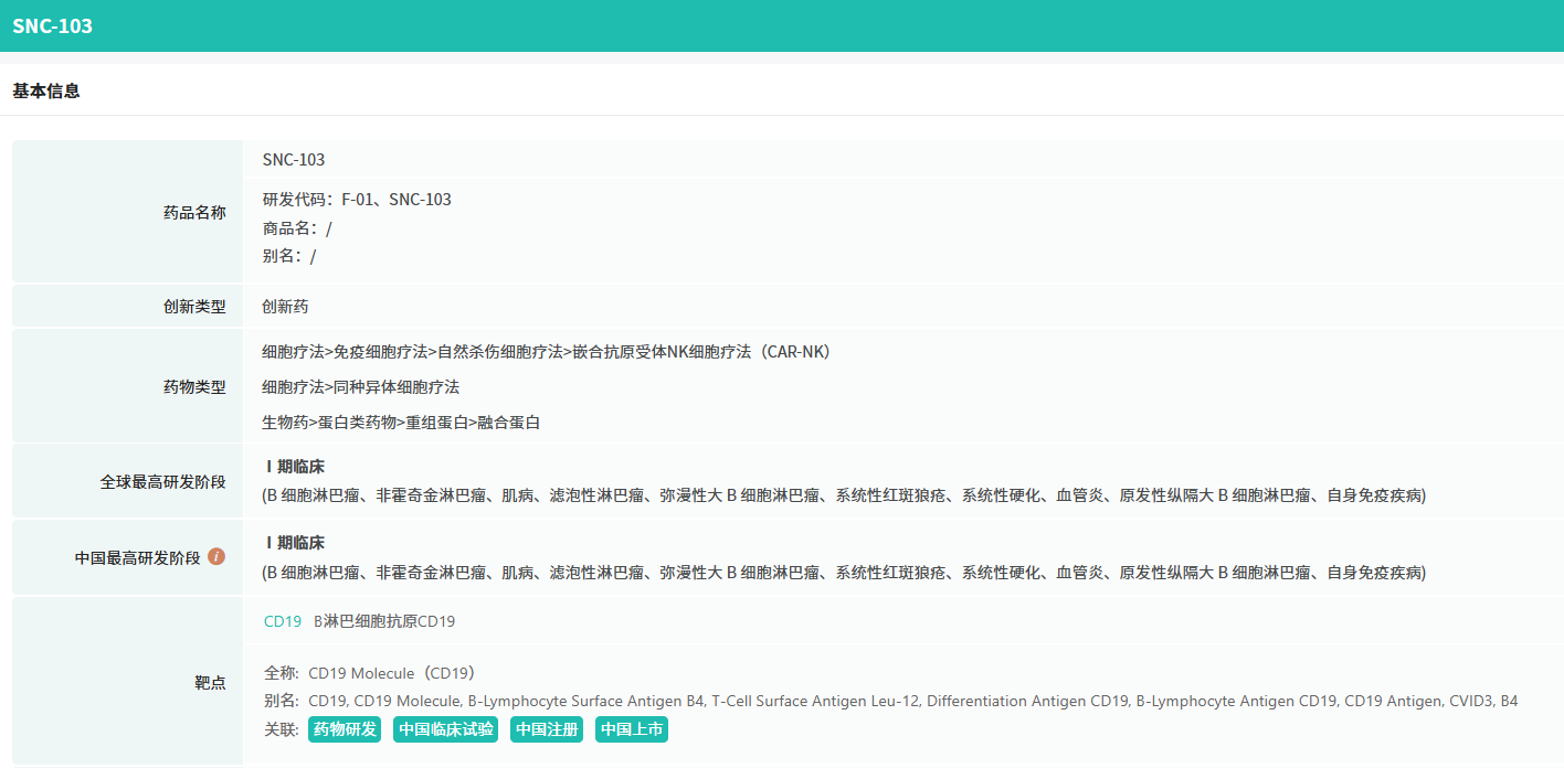 在1月全球创新药研发动态中,1月2日,先博生物宣布,其自主研发的通用型异体CD19 CAR-NK药物SNC103已成功完成两例一期临床给药,该疗法针对复发和/或难治性大B细胞淋巴瘤,两位复发难治的患者均取得较好疗效。SNC103采用了创新设计的拥有自主知识产权的CAR结构,临床前研究中展示出了比同类CAR设计更有效的抗肿瘤免疫反应。