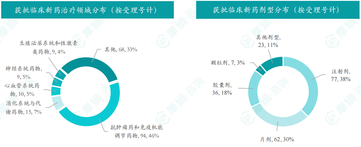 本月获批临床受理号数量最多的新药为抗肿瘤药和免疫机能调节药物,有94个,占比为46%,消化系统与代谢药物获批数量也比较多,有15个。获批剂型主要为注射剂与片剂,分别有77个,62个。