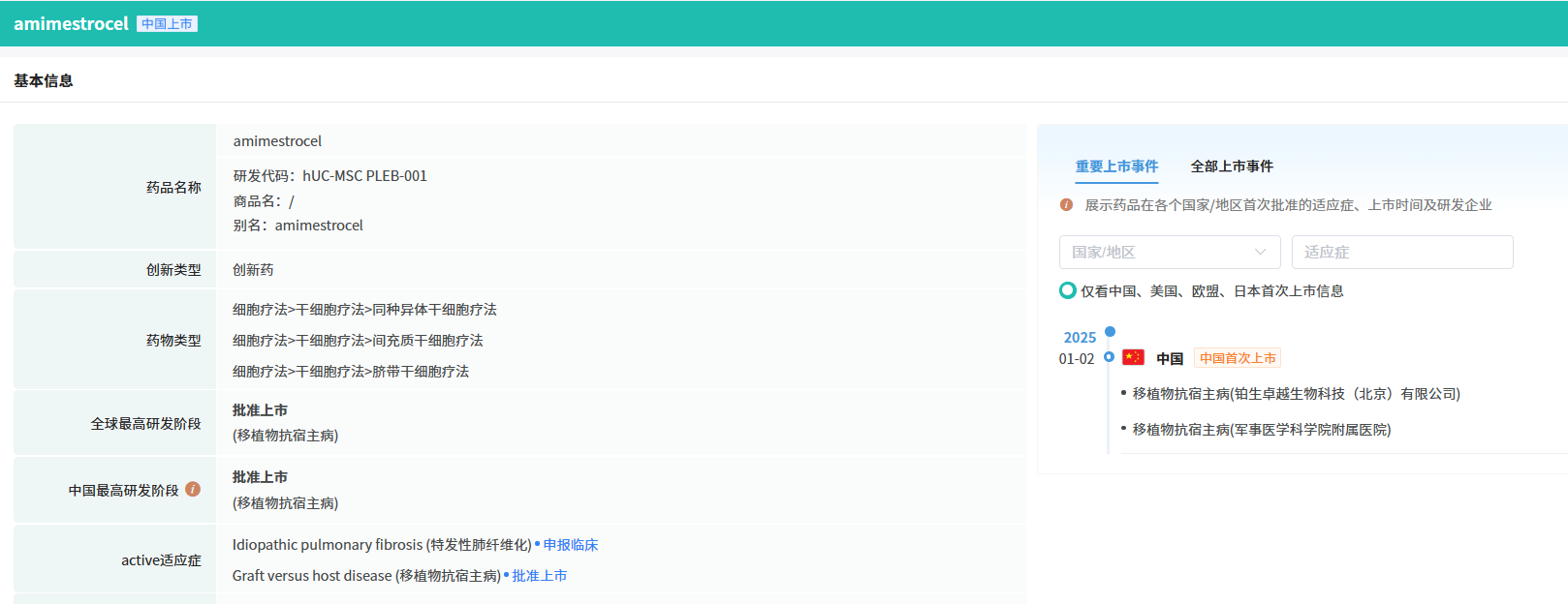 在1月全球创新药研发进展TOP20榜单中,亮点纷呈。1月2日,NMPA官网宣布,通过优先审评审批程序附条件批准铂生卓越生物科技(北京)有限公司申报的艾米迈托赛注射液(商品名:睿铂生)上市,这是铂生生物研发的人脐带间充质干细胞注射液。此次获批的适应症为:用于治疗14岁以上消化道受累为主的激素治疗失败的急性移植物抗宿主病(aGVHD)。GVHD是由于异体移植的干细胞对宿主器官进行免疫攻击导致的严重疾病,它可能影响皮肤、胃肠道和肝脏等多个器官系统的功能。