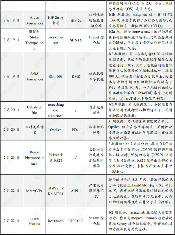2月19日,渤健与Stoke Therapeutics联合宣布其在研产品zorevunersen1/2a期临床试验结果。数据显示,在接受每日两次 casdatifan(50mg)治疗的患者队列中,无进展生存期(PFS)达到 9.7 个月,其它剂量组的 PFS 尚未达到。在所有 3 个剂量组中,casdatifan 的疾病控制率均超过 80%。新闻稿表示,与迄今为止发表的 HIF-2α 抑制剂研究数据相比,casdatifan 在总缓解率(ORR)和中位 PFS 方面均呈现出改善。截至 2025 年 1 月 3 日,大多数患者(81–87%)病情得到控制,表现为部分缓解或疾病稳定,而且大多数患者仍在接受治疗。中位缓解持续时间尚未达到,所有三个组中 26 例应答患者中除两例外均仍在接受治疗。来自 1/2a 期研究及开放标签延伸研究的数据表明,接受 zorevunersen 治疗的患者在抽搐性癫痫发作频率上均有显著且持久的降低,同时在多项认知和行为指标上也表现出改善,这些结果为推进全球 3 期注册研究提供了坚实支持。