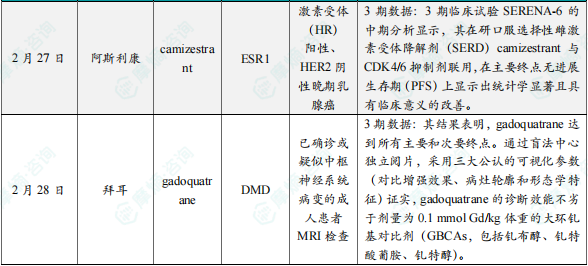 2月27日,阿斯利康宣布其在研口服选择性雌激素受体降解剂(SERD)camizestrant治疗激素受体(HR)阳性、HER2阴性晚期乳腺癌的3期临床试验SERENA-6的中期分析结果。Camizestrant通过靶向ESR1发挥作用,主要用于治疗HR阳性、HER2阴性晚期乳腺癌。中期分析显示,camizestrant与CDK4/6抑制剂联用,在主要终点无进展生存期(PFS)上显示出统计学显著且具有临床意义的改善。这一结果表明camizestrant在乳腺癌治疗中具有良好的应用前景,为患者提供了新的治疗选择。