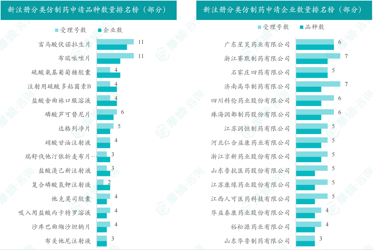 江苏神龙药业有限公司、石药集团欧意药业有限公司、辰欣药业股份有限公司是申请品种最多的企业,均有2个品种。