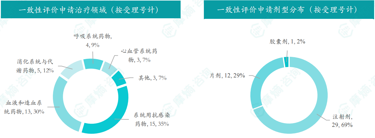 - 申请品种主要为系统用抗感染药物,申请剂型主要为注射剂;