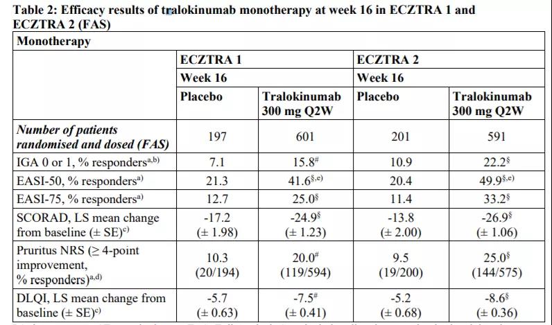 在此之前,本品已经在6月份获得了EMA的批准。截止发文之日,FDA的说明书还不可用,EMA说明书显示,两项分别有802和794名患者参与的临床试验证明了本品的疗效。两项试验均为3:1分组,分别给予本品或安慰剂,主要终点为16周研究者评分(IGA)为0分和1分及湿疹面积及严重度指数( EASI)相比基线改善达到75%的患者比例(应答率)。结果显示,两项试验的IGA评分应答率分别为15.8% vs 7.1%和22.2% vs 10.9%,EASI-75的应答率分别为25.0% vs 12.7%和33.2% vs 11.4%,均达到了主要终点,具体数据如下所示: