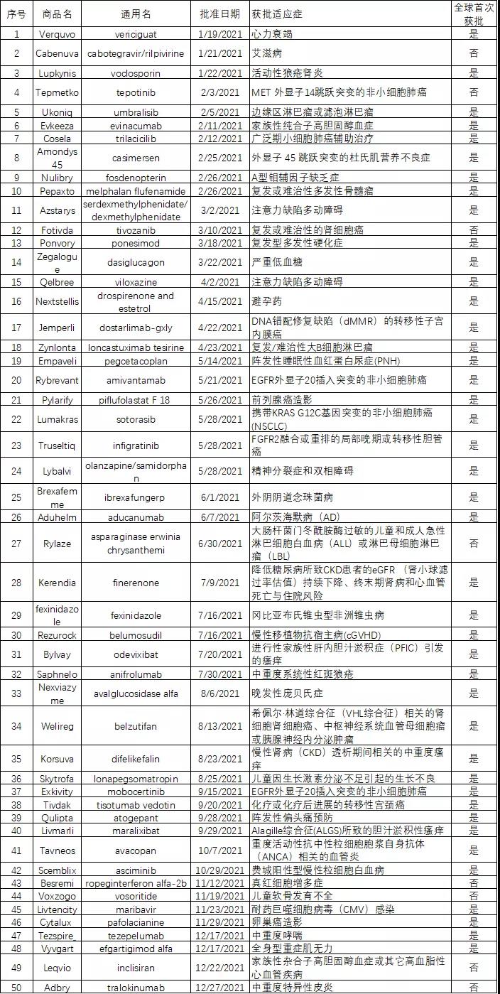 2021年FDA批准的50个新药
