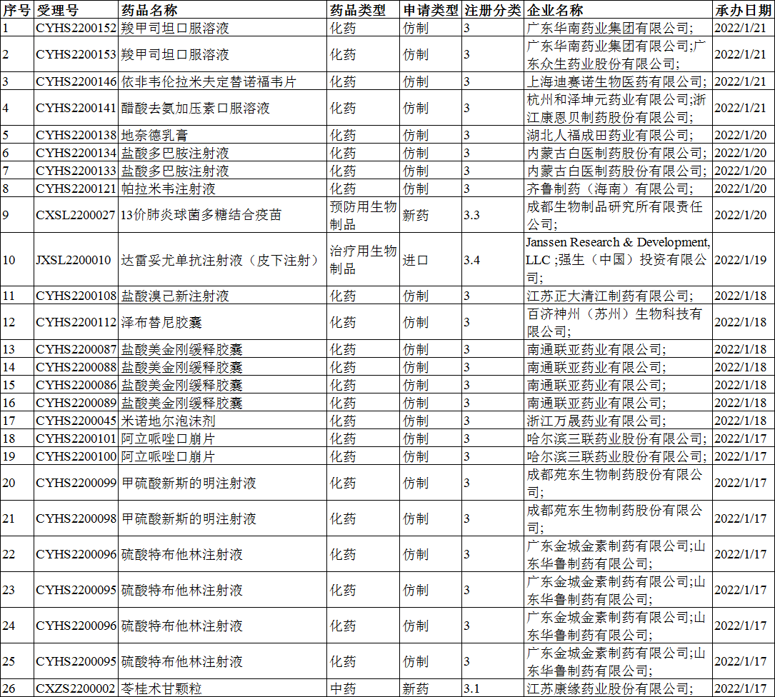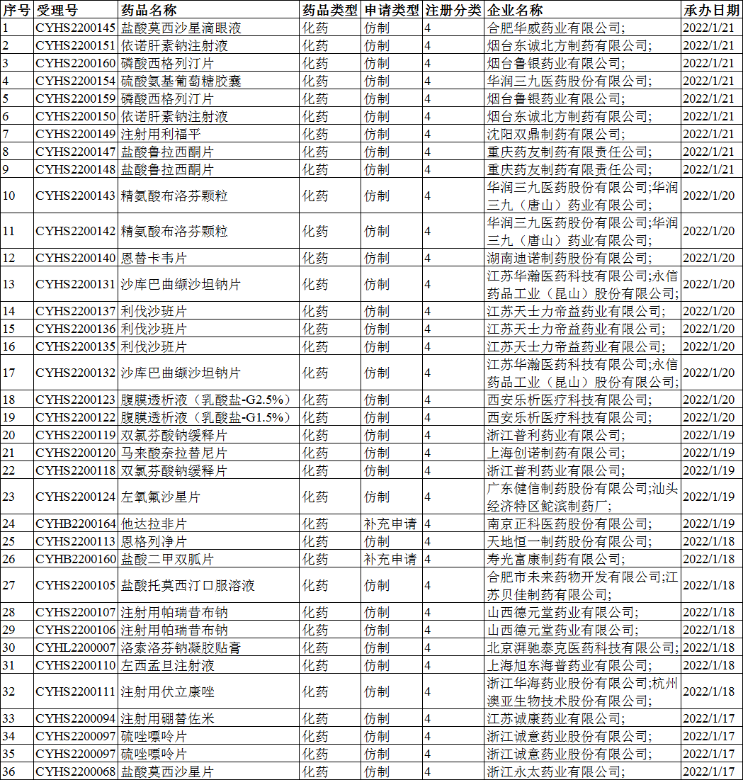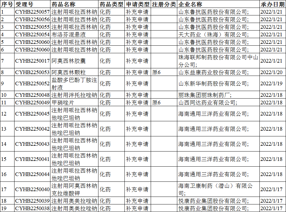 2022年1月10-16日CDE共承办19个一致性评价受理号,详情见下表。
