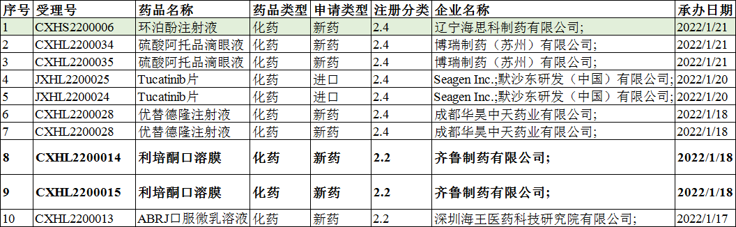 2022年1月17-23日CDE共承办10个改良型新药受理号,均为化药受理号。