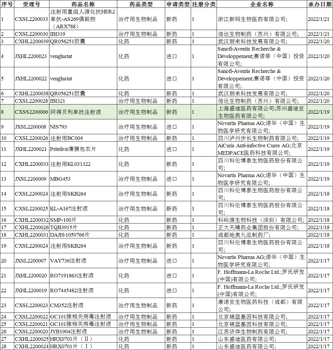 28个受理号中,国产药品受理号20个,进口药品受理号8个。