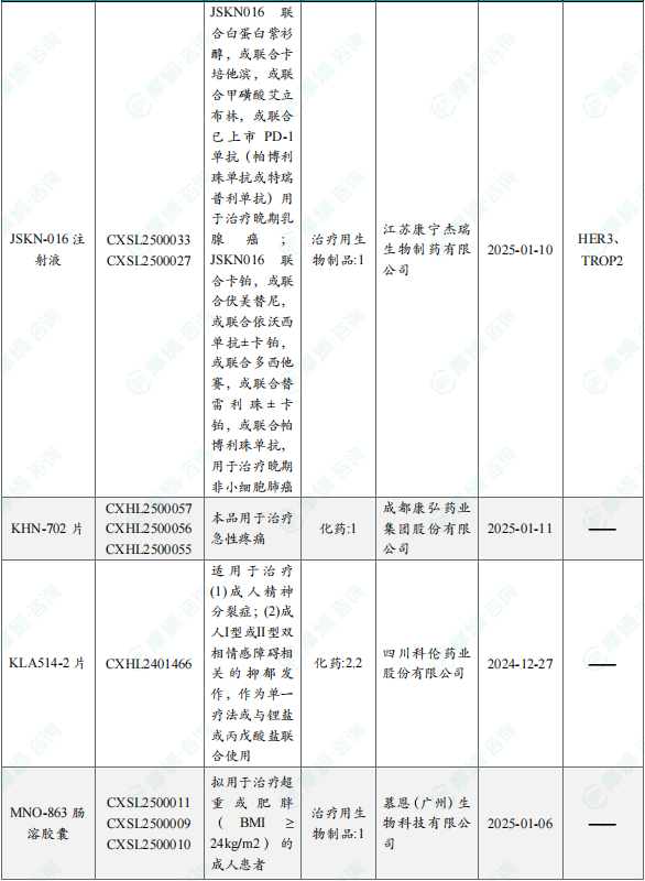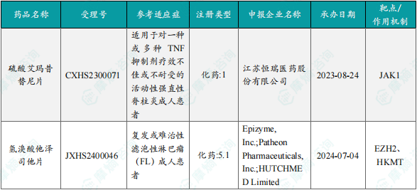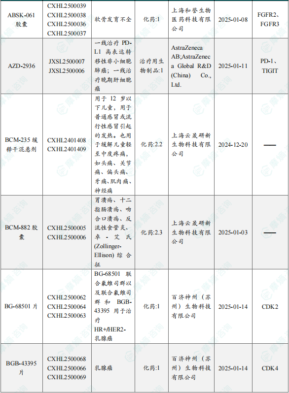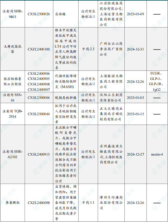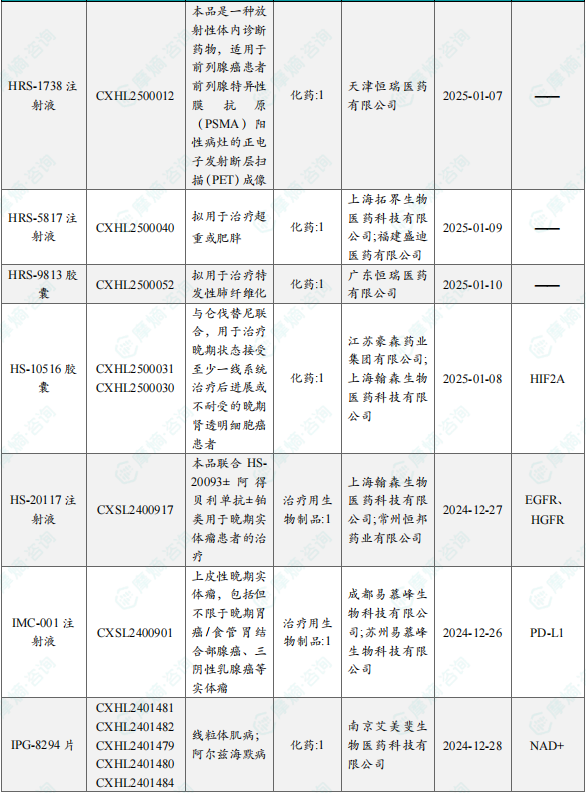 备注:(1)此处未包括补充申请之情形;(2)此处所列创新药/改良型新药,主要是指CDE受理批准的1类、2类、5.1类以及生物制品3.1类和3.2类。(3)更多获批临床信息及研发进展详情及相关靶点全局分析等,可通过摩熵医药中国药品审评数据库获取并下载EXCEL表格。