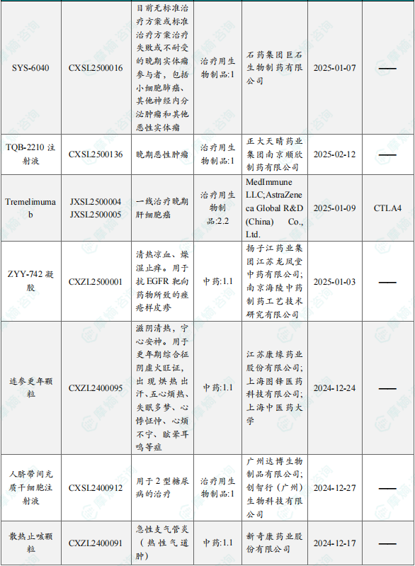 备注:(1)此处所列新药,主要是指国家药品监督管理局(NMPA)首次批准在中国上市的药品,包括新分子实体(以及包含有新分子实体的复方)、生物药、中药和疫苗。其中,新分子实体主要是化药注册分类下的1类(境内外均未上市的创新药)、5.1类(境外上市的原研药申请在国内上市);生物药主要为NMPA首次批准的国产及进口生物药;不包括生物类似物、新适应症、新剂型。(2)更多信息如获批临床品种相关靶点、研发企业、全球上市及研发进展及相关靶点全局分析等,可通过摩熵医药数据库获取并下载EXCEL表格。