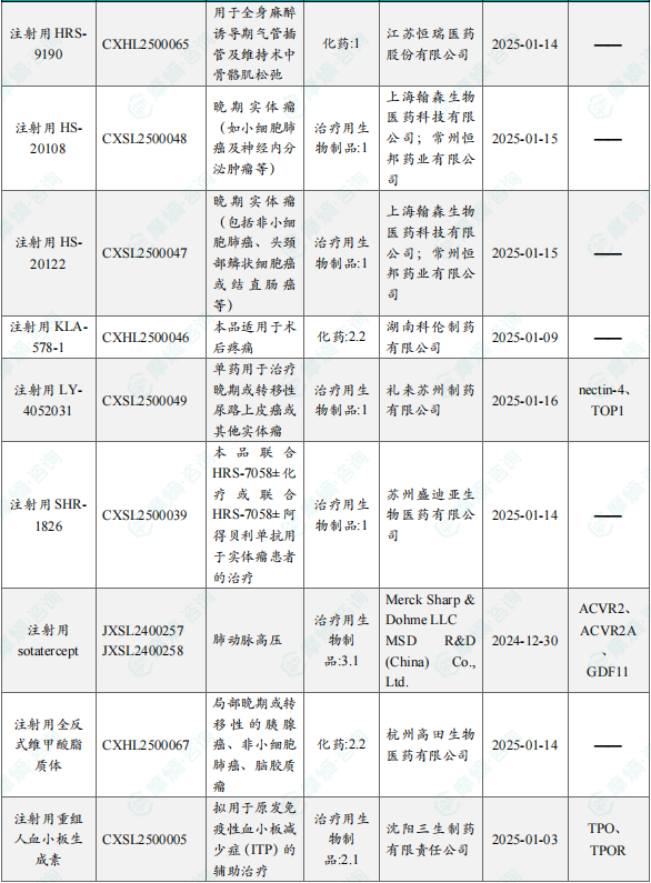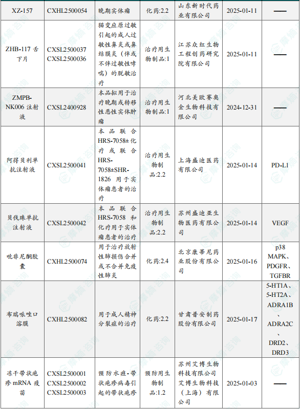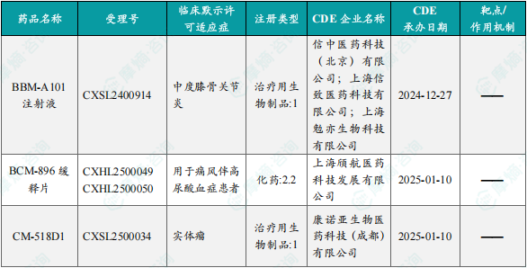 备注:(1)此处未包括补充申请之情形;(2)此处所列创新药/改良型新药,主要是指CDE受理批准的1类、2类、5.1类以及生物制品3.1类和3.2类。(3)更多获批临床信息及研发进展详情及相关靶点全局分析等,可通过摩熵医药中国药品审评数据库获取并下载EXCEL表格。