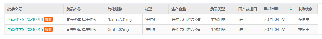 2021年4月27日,中国国家药品监督管理局(NMPA)批准诺和诺德旗下诺和泰®(Semaglutide,司美格鲁肽注射液)上市,用于每周皮下注射一次,辅助饮食和运动以改善2型糖尿病(T2DM)患者的血糖控制。(诺和泰®(司美格鲁肽注射液)是继利拉鲁肽之后,诺和诺德在中国上市的第二款GLP-1新药产品,也是国内市场第八款GLP-1受体激动剂相关药物。)