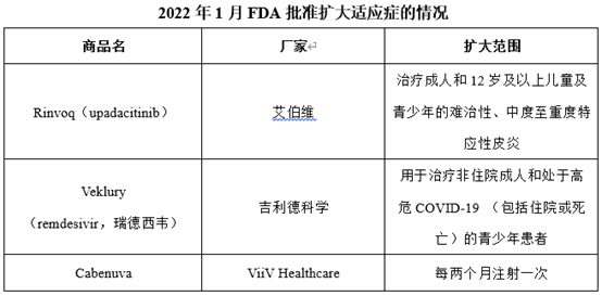 2022年1月,美国FDA共批准3款药物扩大适应症情况,具体信息如下: