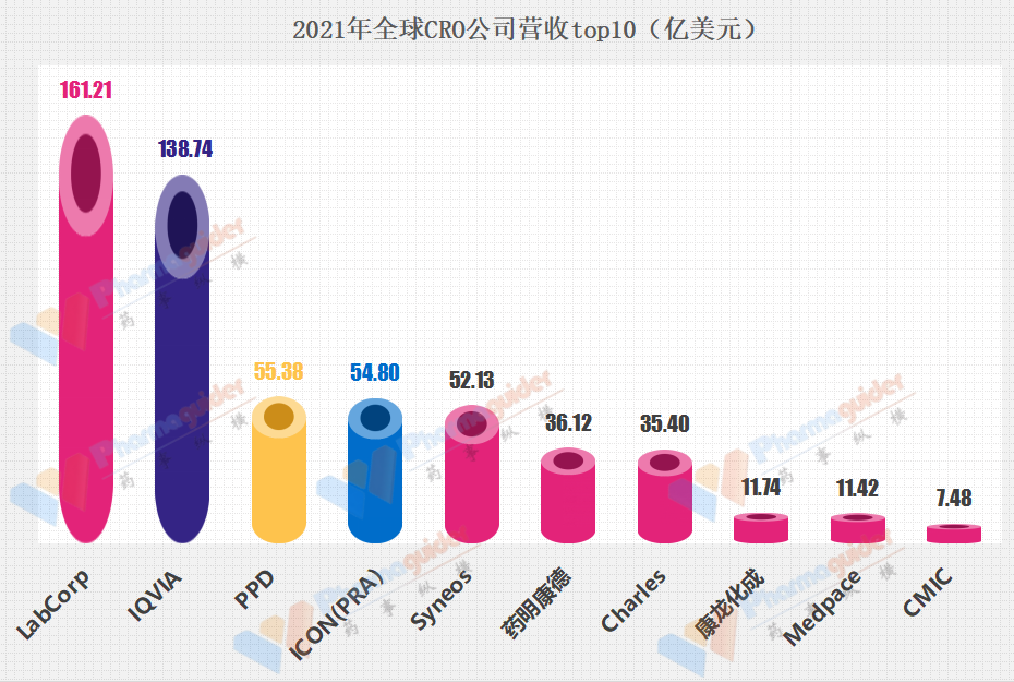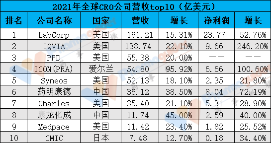 我们从各大CRO公司近期公布的2021年营收来看,top10如下: