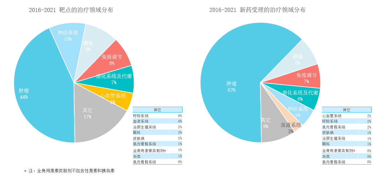 回顾2016-2021年国内肿瘤领域涉及的靶点数量和新药受理数量都位居榜首;肿瘤靶点占比为44%,新药受理中肿瘤领域占药品的62%,不难看出目前国内热门靶点同质化“内卷”严重,主要集中在肿瘤领域,生物药和化药临床试验适应症都以抗肿瘤为主,有业内人士分析,“同质化”现象会对于临床资源造成一些浪费,在选择疾病和靶点立项时,就像是选择赛道,选对了疾病和靶点,研发做的快慢,可能只是价值的大小,如果选错了靶点,所有的付出都会付之东流。