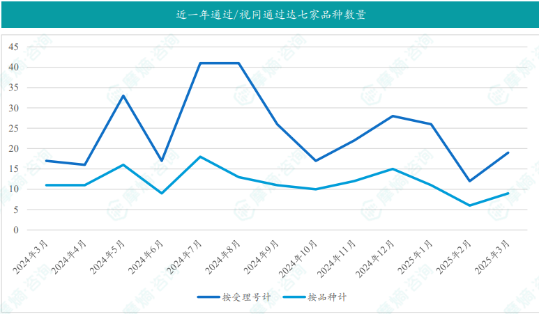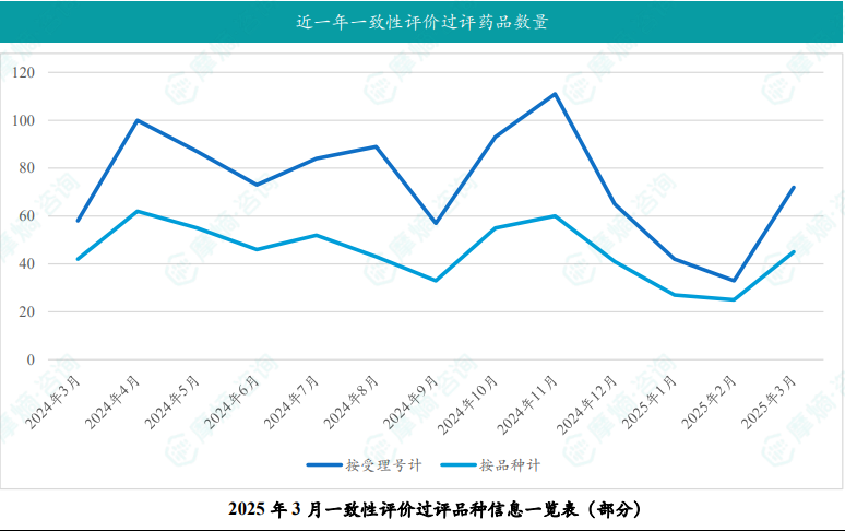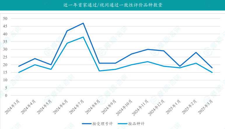 根据摩熵数据统计,2025年3月期间共有195个(共计342个受理号)品种通过/视同通过(新注册分类仿制药获批上市)一致性评价,其中一致性评价过评品种数量45个,视同通过一致性评价品种数量160个。