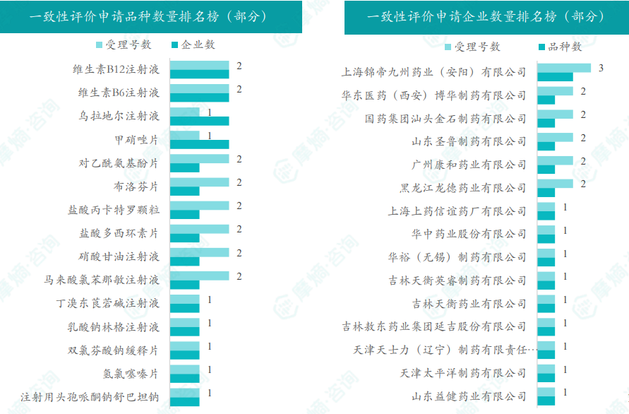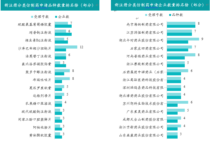 - 维生素B12注射液、维生素B6注射液、乌拉地尔注射液和甲硝唑片为申请企业数最多的品种,均有2家。
