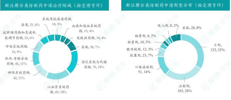 - 申请品种主要为心血管系统药物,申请剂型主要为注射剂和片剂;