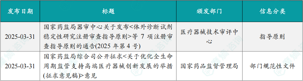 3月31日,国家药监局研究并形成了《关于优化全生命周期监管支持高端医疗器械创新发展的举措(征求意见稿)》,旨在完善审评审批机制,加强全生命周期监管,全力支持高端医疗器械重大创新,促进更多新技术、新材料、新工艺和新方法应用于医疗健康领域。