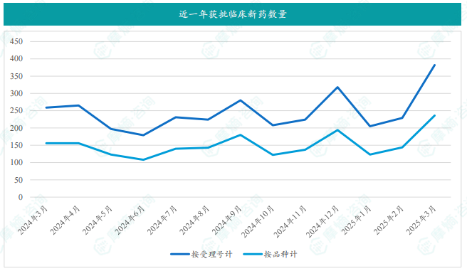 根据摩熵医药数据库统计,2025年3月共有236款新药获批临床(共计382个受理号),较上个月增加了92款,其中包括115款化药,112款生物制品,9款中药。