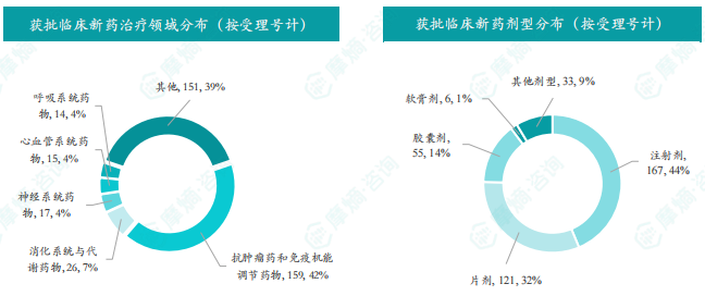 本月获批临床受理号数量最多的新药为抗肿瘤药和免疫机能调节药物,有159个,占比为42%,消化系统与代谢药物获批数量也比较多,有26个。获批剂型主要为注射剂与片剂,分别有167个,121个。