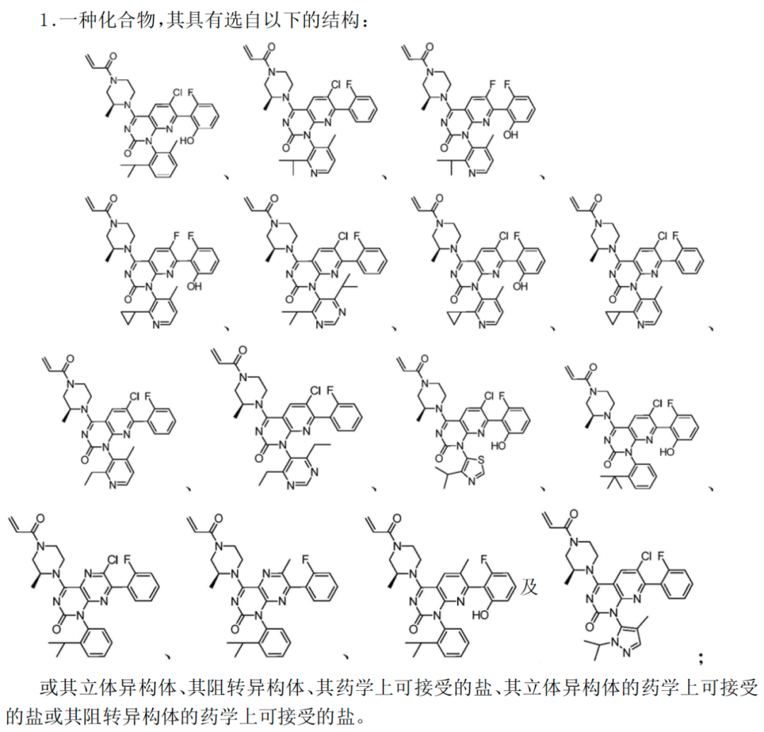 权利要求1如图1.2.1.1所示,上市药物Sotorasib即为第3个化合物(共15个化合物);权利要求2-16对每个化合物结构及其“立体异构体、阻转异构体、药学上可接受的盐、立题异构体的药学上可接受的盐或其阻转异构体的药学上可接受的盐”进行了保护。