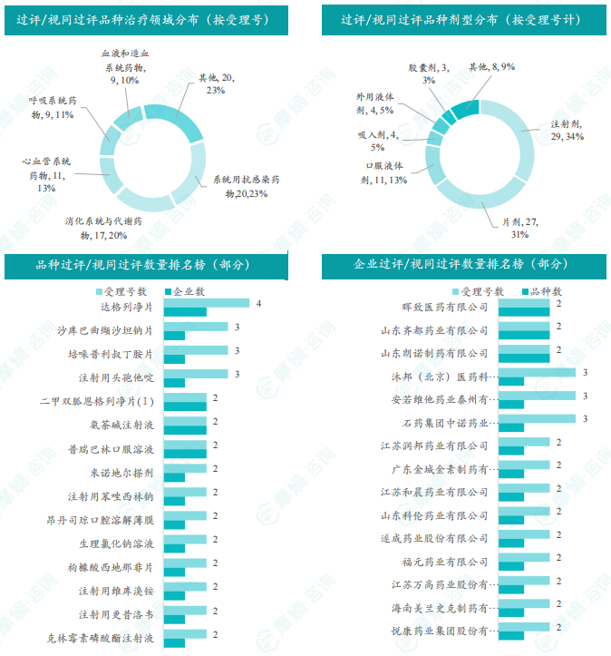 本周达格列净片过评/视同过评受理号数量最多达4个,本周达格列净片、二甲双胍恩格列净片(Ⅰ)、氨茶碱注射液和普瑞巴林口服溶液过评/视同过评企业最多达2家;