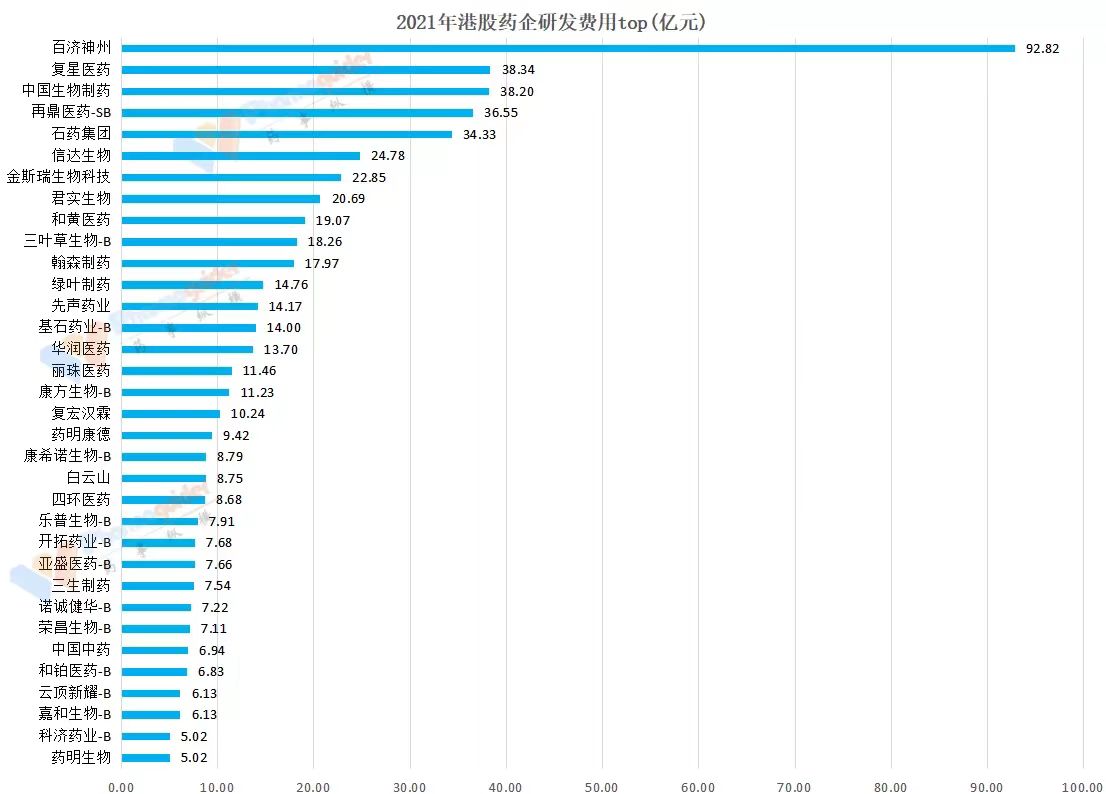 1、百济神州、复星医药和中国生物制药排名前三,去年研发投入分别为92.82亿元,38.34和38.2亿元。后两位研发投入增长超过30%。百济神州研发费用同比小幅增长4%,去年PD-1营收16.5亿元。石药集团、翰森药业、华润医药等大药企去年研发费用分别为34.3亿元,17.97亿元和13.7亿元。