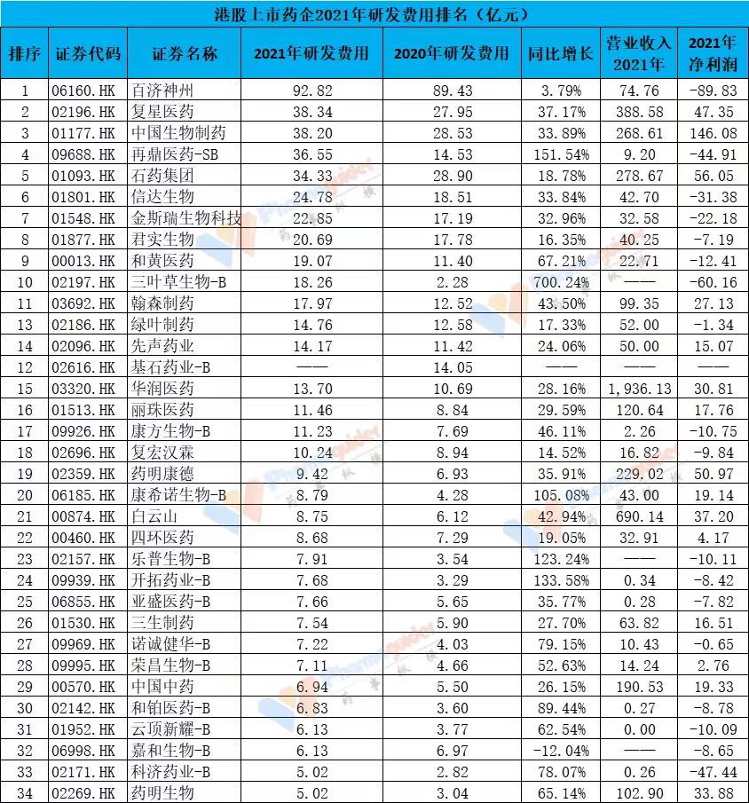 截止到4月1日,港股上市药企(按照GICS分类)2021年财报基本披露完毕,我们整理数据排名如下: