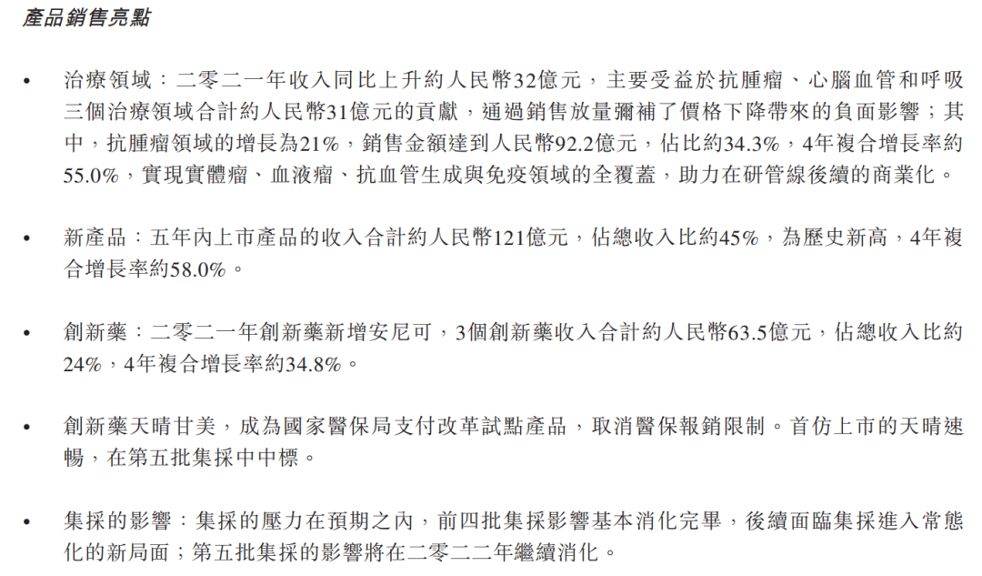治疗领域:二零二一年收入同比上升约人民币32亿元,主要受益于抗肿瘤、心脑血管和呼吸三个治疗领域合计约人民币31亿元的贡献,通过销售放量弥补了价格下降带来的负面影响;