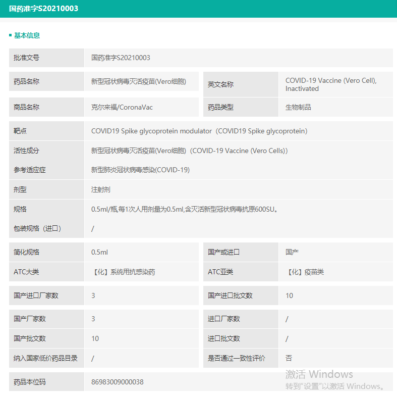 北京科兴中维新冠疫苗(Vero细胞)批文信息