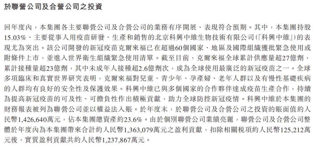 2021年共营收268.6亿元,同比增长13.6%;归母净利润146.1亿元,同比增长427.2%,净利大增的原因,主要是来自于其持股的新冠疫苗企业“北京科兴中维新冠疫苗”的贡献。