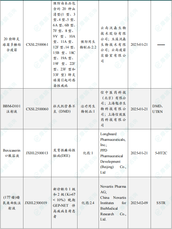 备注:(1)此处所列新药,主要是指国家药品监督管理局(NMPA)首次批准在中国上市的药品,包括新分子实体(以及包含有新分子实体的复方)、生物药、中药和疫苗。其中,新分子实体主要是化药注册分类下的1类(境内外均未上市的创新药)、5.1类(境外上市的原研药申请在国内上市);生物药主要为NMPA首次批准的国产及进口生物药;不包括生物类似物、新适应症、新剂型。(2)更多信息如获批临床品种相关靶点、研发企业、全球上市及研发进展及相关靶点全局分析等,可通过摩熵医药数据库获取并下载EXCEL表格。