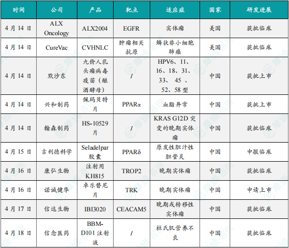 1. 2025年第16周04.14-04.20国内创新药/改良型新药申请临床/获批临床/申请上市/获批上市数据分析