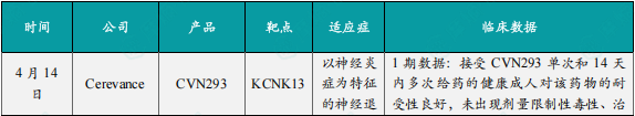 4月14日,Cerevance公司公布了其钾双孔结构域通道亚家族K成员13(KCNK13)抑制剂 CVN293 的积极1期临床试验结果。CVN293 是一种高选择性口服KCNK13抑制剂,旨在通过抑制神经炎症减缓神经退行性疾病进展,KCNK13是一种潜在的NLRP3炎性小体激活的新型调节因子。1期临床试验结果显示,接受CVN293单次和14天内多次给药的健康成人对该药物的耐受性良好,100%的受试者完成了试验,未出现剂量限制性毒性、治疗相关停药或具临床意义的生命体征异常,所有不良事件均为轻度。CVN293还显示出强大的脑渗透性,支持KCNK13抑制剂对以神经炎症为特征的神经退行性疾病的效用。