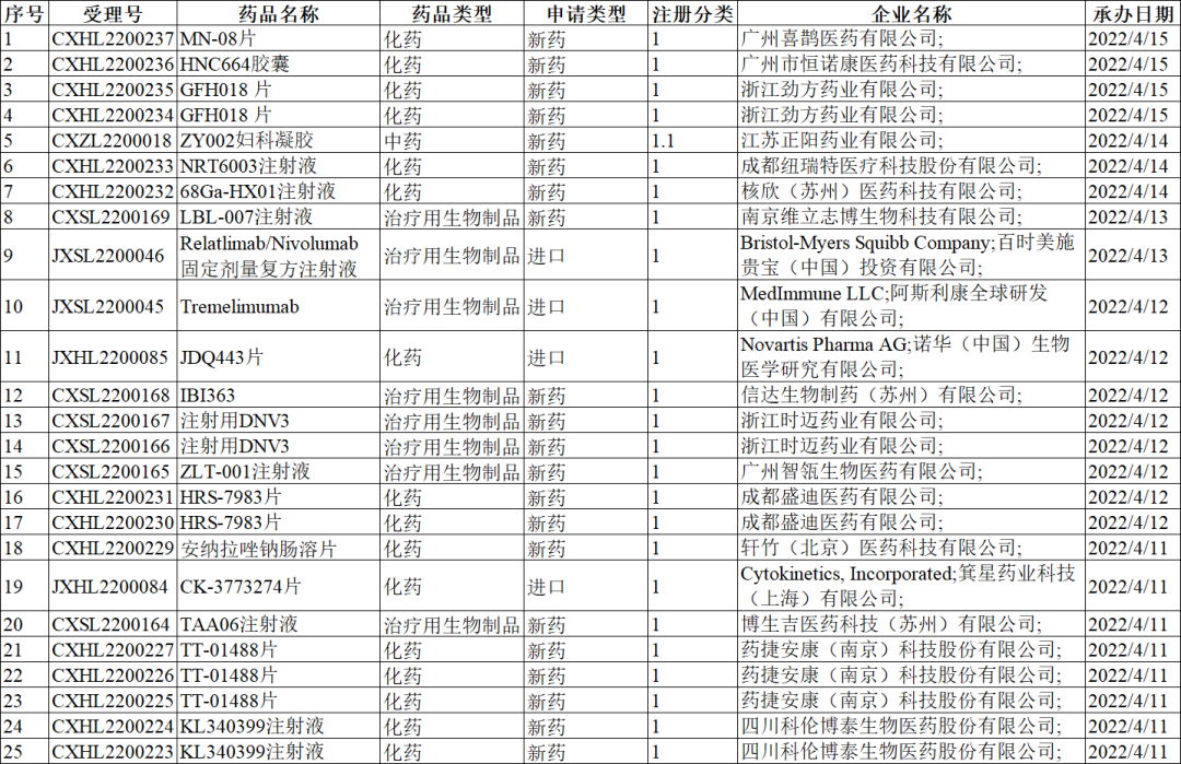2022年4月11日-17日CDE共承办25个创新药受理号,其中包括了化药受理号16个,生物制品受理号8个,中药受理号1个 。此次的25个1类新药受理号均为临床试验申请。