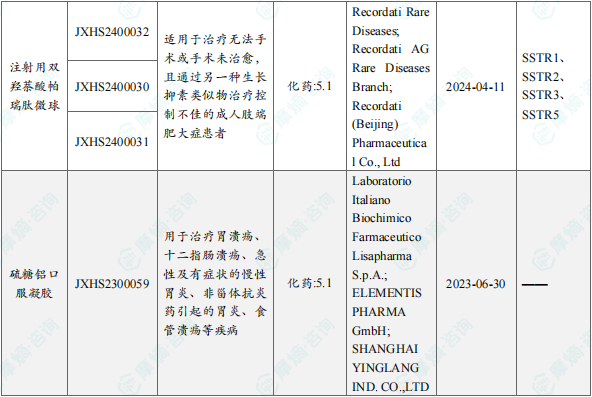 4月25日,国家药监局发布药品批准证明文件送达信息:Recordati集团的注射用双羟萘酸帕瑞肽微球获批上市,适用于治疗无法手术或手术未治愈,且通过另一种生长抑素类似物治疗控制不佳的成人肢端肥大症患者。公开资料显示,注射用双羟萘酸帕瑞肽微球是第二代SRL,通过与生长抑素受体结合减少生长激素释放,降低下游IGF-1浓度,实现对疾病的生化控制,并且对垂体肿瘤产生抗增殖作用。