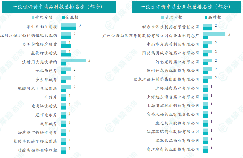 维生素B6注射液为申请企业数最多的品种,有3家;新乡市常乐常乐制药有限责任公司是申请品种最多的企业,有2个品种。
